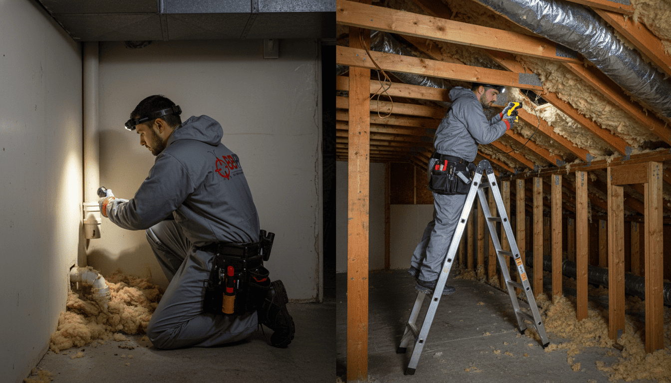 Basements and attics provide warm shelter for nesting. Our team combines trapping with attic decontamination and sill-plate sealing.